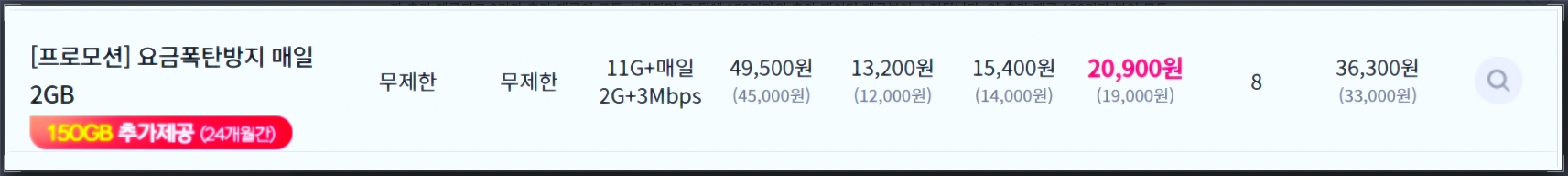 좀 이해가 안 됐던 요금제입니다 일단 A 모바일의 요금폭탄 방지 매일 2기가는 KT와 LG요금제와 동일하게 매일 11기가 소진 시 추가 2기가 역시 소진시 150기가를 추가 제공합니다 하지만 금액은 20,900원이죠