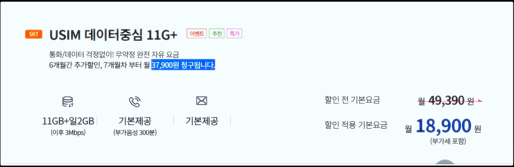 이 요금제가 정말 대박인데  요금제는 다른 회사와 비슷합니다 근데 6개월 프로모션 기간 동안에 월 18,900원으로 이용이 가능합니다 기간이 종료되는 7개월 차부터 37,900원으로 인상됩니다 전부 소진 시 3 Mbps로 이용이 가능합니다.