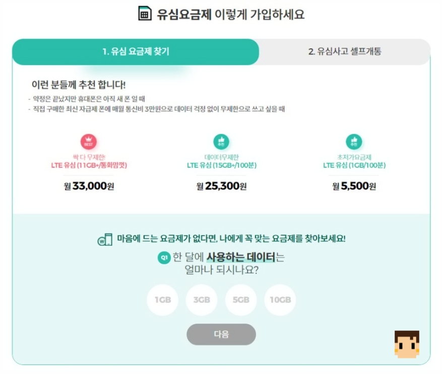 일단 요금제를 알아보셔야 하는데 알뜰폰 요금제는 대부분 비슷합니다 아마 이셋중에 고르시면 될 거예요