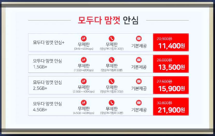 가장 저렴합니다 그리고 가장 가입해요 일단 현재 3개월째 사용중인데 너무 만족하면서 사용 중이에요 고객센터도 3번 정도 전화했는데 1분 정도 기다렸나? 바로 연결됩니다 셀프 개통이라 후회하면 어쩌나 걱정했는데 너무 쉬워서 허탈했어요